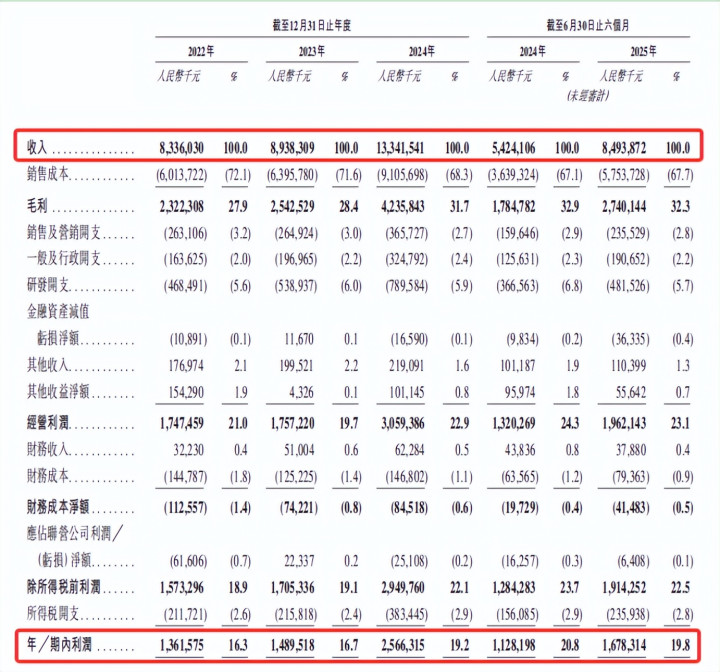 近年来沪电股份的营收和利润保持增长。招股书显示,2022年- 2025年上半年,公司实现收入分别为83.36 亿元、89.38 亿元、133.42 亿元、84.94 亿元;同期净利润分别为13.62 亿元、14.90 亿元、25.66 亿元、16.78 亿元。毛利率分别为27.9%、28.4%、31.7%、32.3%。