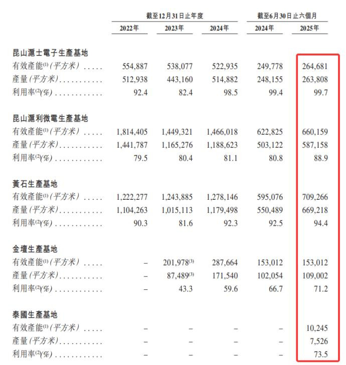 位于常州市的金坛生产基地在被沪电股份收购前是亏损资产,主要生产汽车用PCB。虽然沪电股份通过技术改造,将该基地的产能利用率从2022年的43.3%提升至2025年上半年的71.2%,但仍远未满产。另外,公司的泰国生产基地刚开始试产,产能利用率也只有73.5%。
