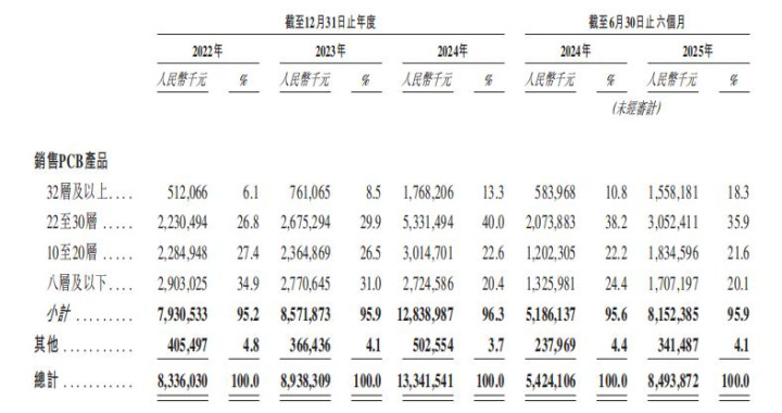 从PCB产品层数划分看,沪电股份22层至30层、32层及以上PCB产品收入占比趋高,由2022年的32.9%升至2025年上半年的54.2%;10至20层、8层及以下PCB产品收入占比则由62.3%降至41.7%。